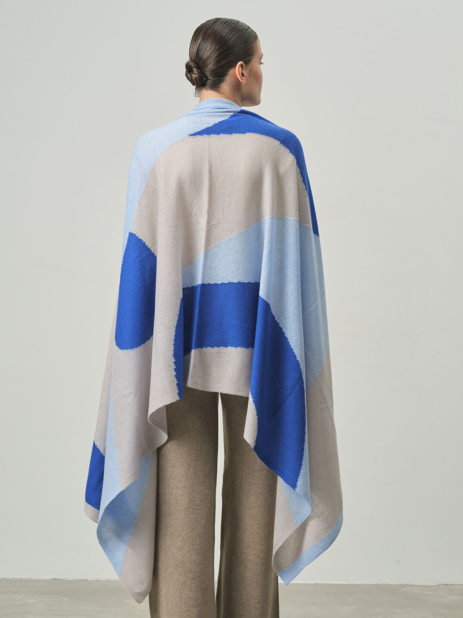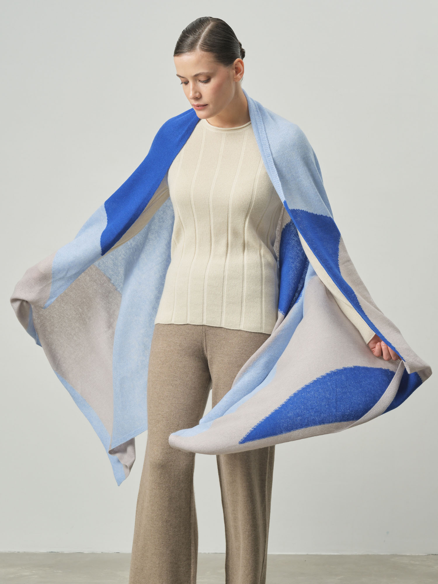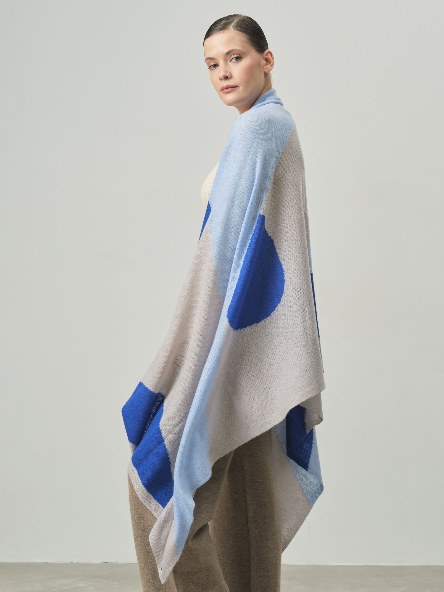 Безумно красивый цвет! Голубой оттенок очень нежный и освежающий. 100% кашемир потрясающего качества - мягкий, теплый, приятный к телу.
