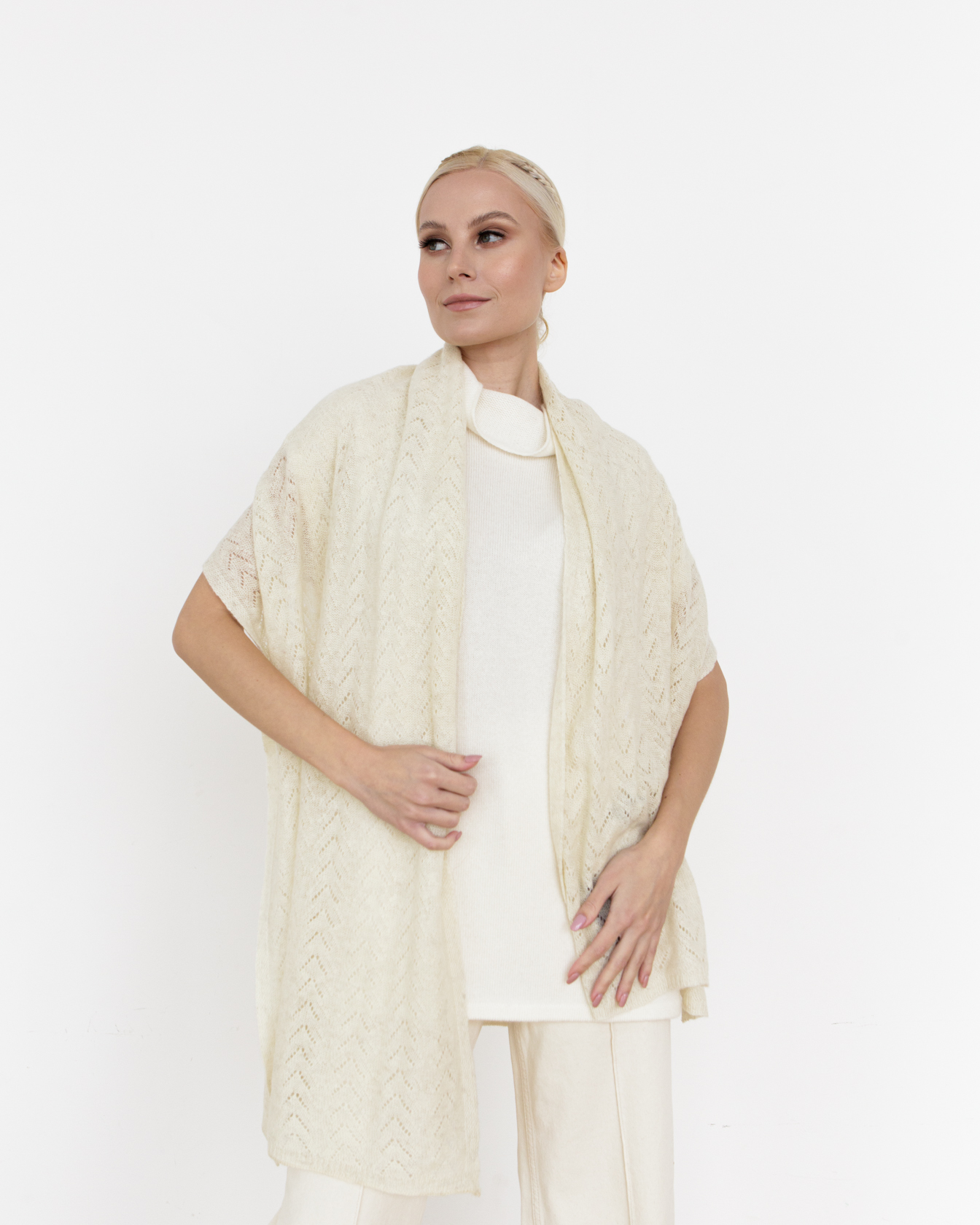 Модель выполнена в классической прямоугольной форме с декоративной ажурной вязкой и фактурным узором. Легкая структура ткани придает изделию воздушность и делает его элегантным элементом образа.