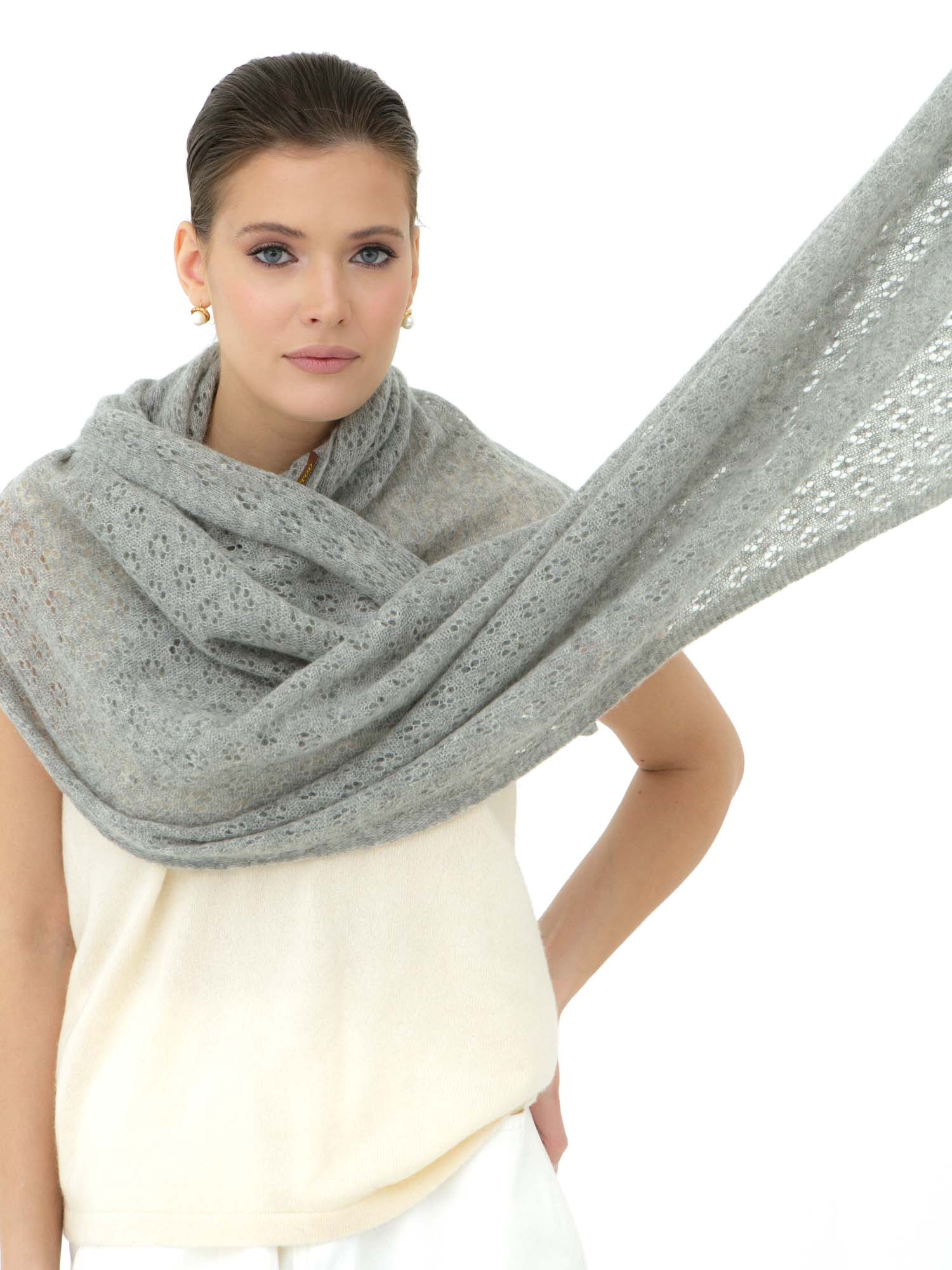 Модель выполнена в свободной форме с выразительной фактурной вязкой, создающей объёмную текстуру. Пластичная структура материала позволяет палантину красиво струиться и формировать мягкие складки.