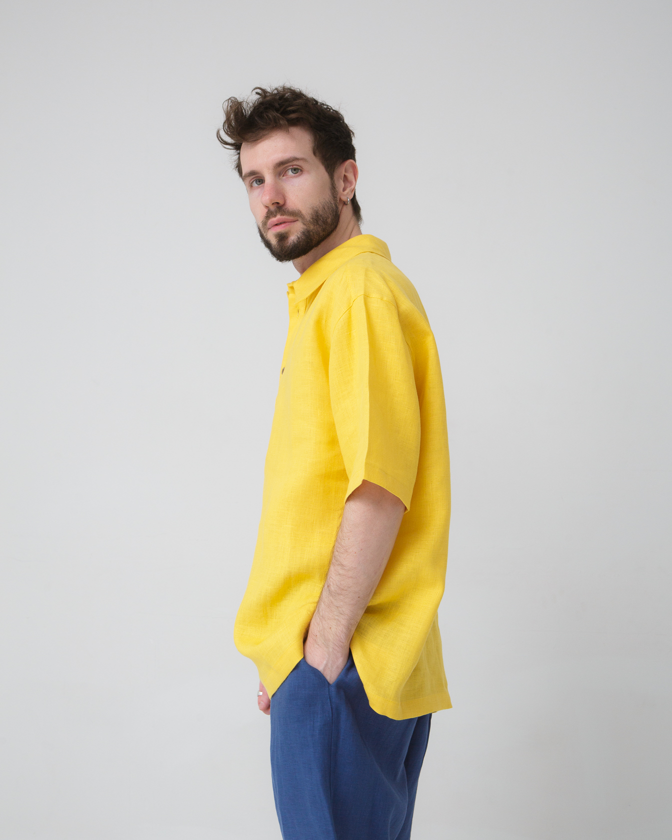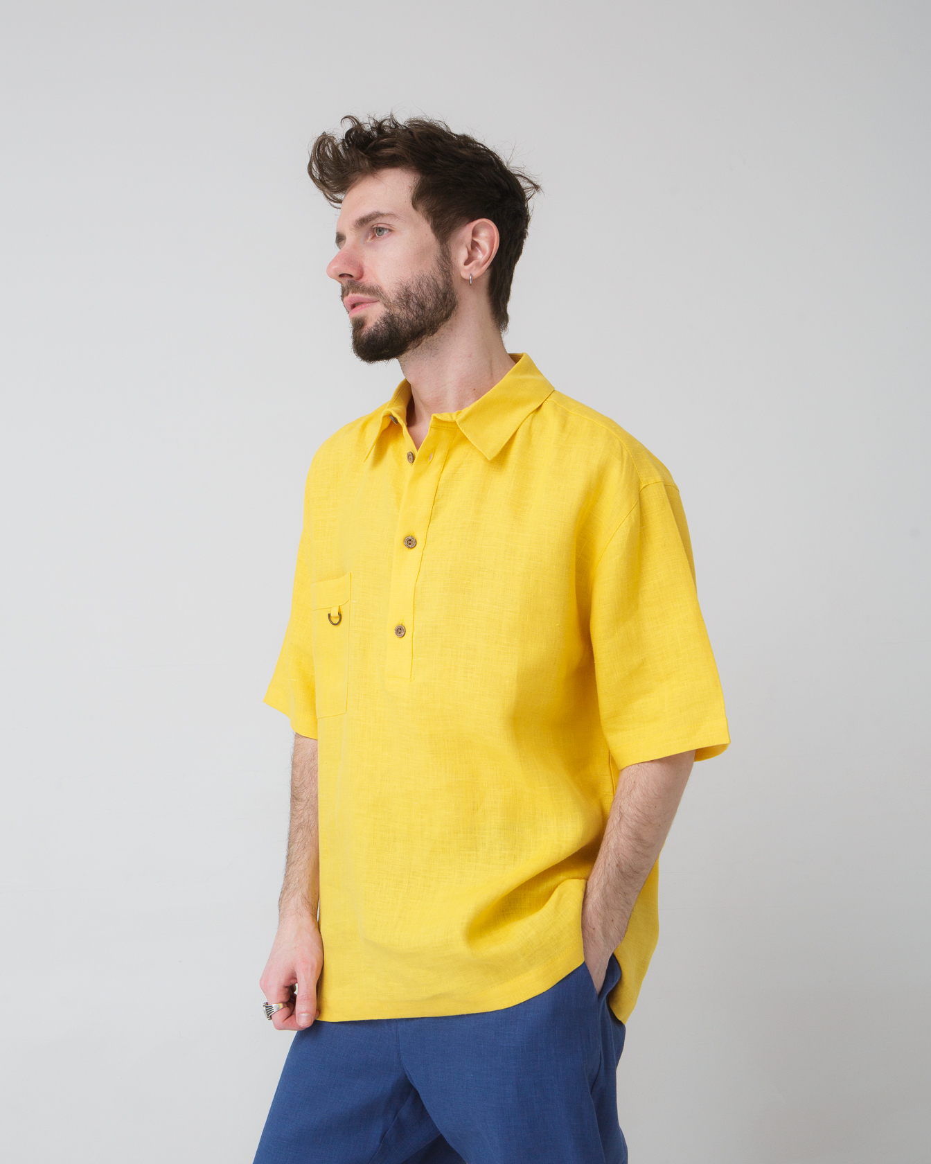 Мужская льняная рубашка-поло в желтом оттенке — яркая и комфортная модель для летнего гардероба. Свободный крой и натуральная ткань создают ощущение легкости и свободы, а современный дизайн делает образ стильным и непринужденным. Идеальный выбор для отдыха, прогулок и повседневной носки.