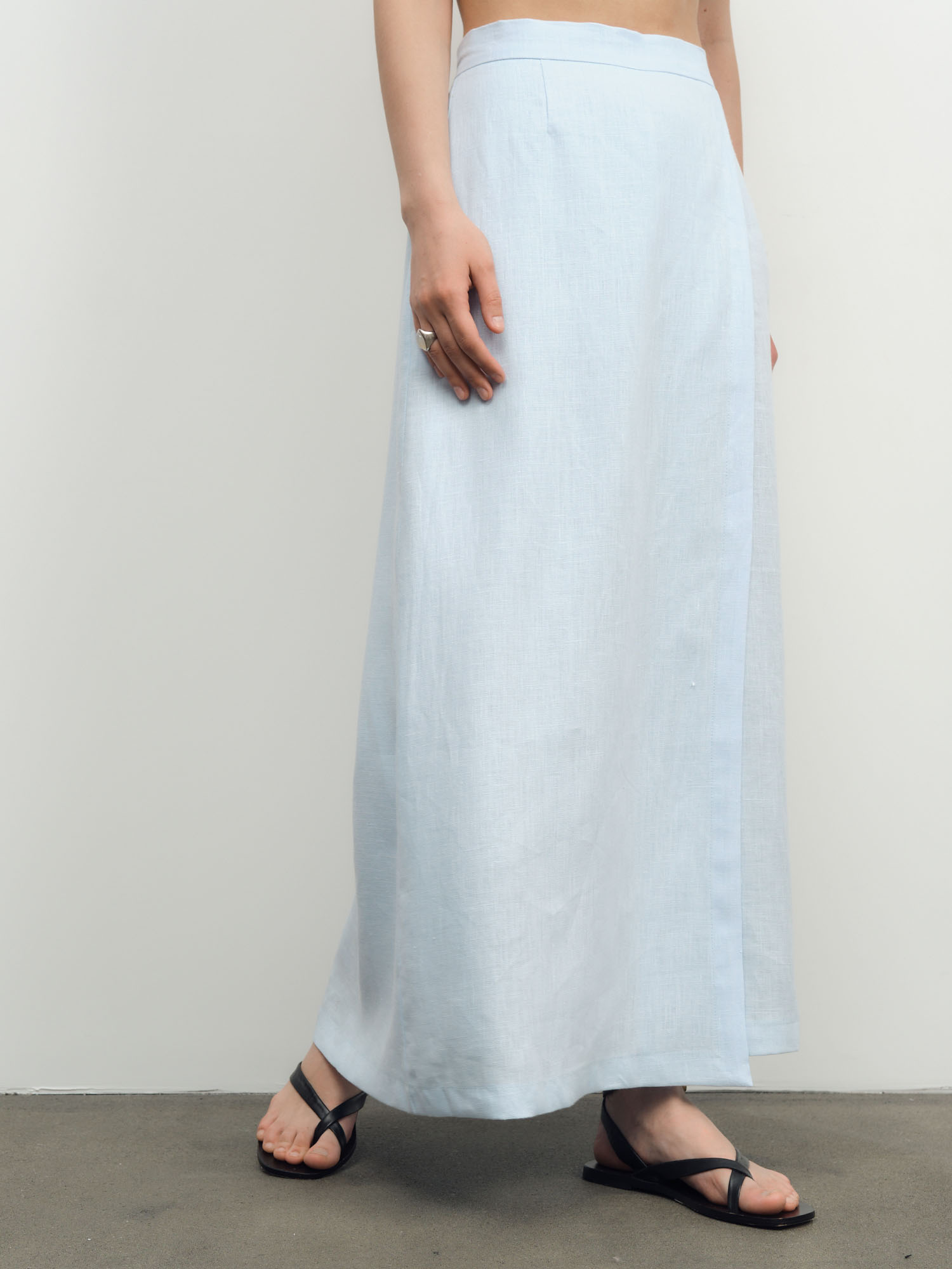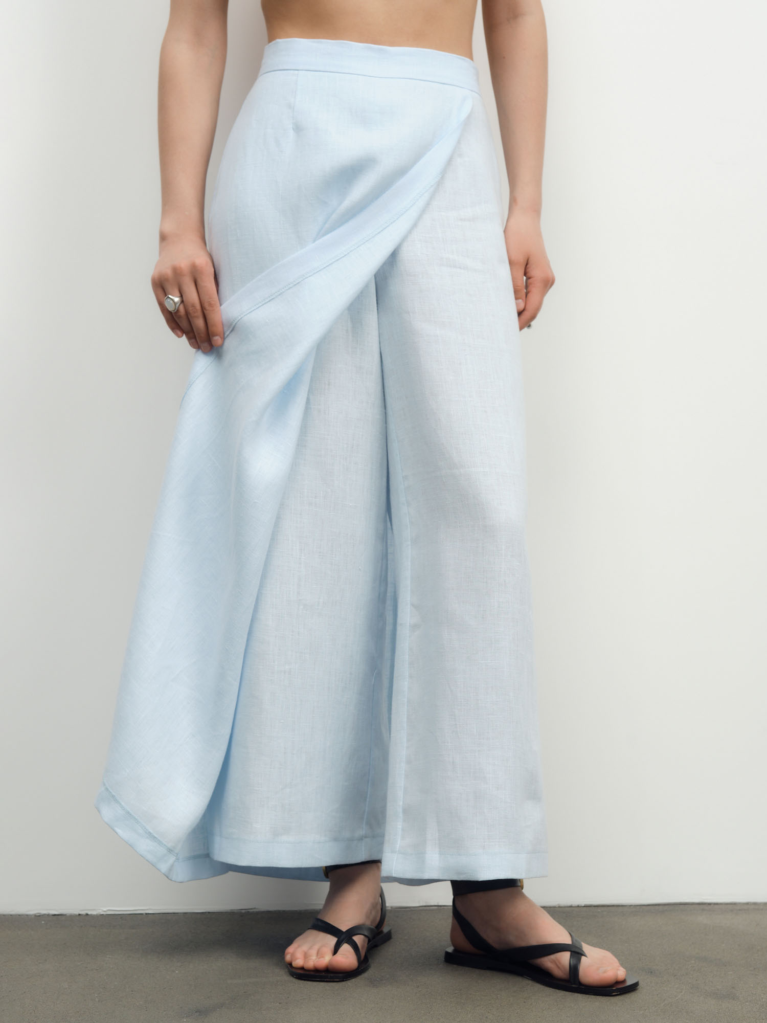 Юбка-брюки из льна — легкая и элегантная модель, сочетающая женственность юбки и удобство брюк. Отлично подходит для летнего гардероба и создания свежих образов. Материал: 100% лен — натуральный дышащий материал, обеспечивающий комфорт даже в жаркую погоду. Прочный, экологичный и приятный к телу. Дизайн: Свободный расклешенный силуэт с эффектом юбки. Конструкция модели обеспечивает свободу движений и визуальную легкость. Цвет: Голубой — нежный и освежающий оттенок, придающий образу легкость и воздушность. Детали: Модель с запахом спереди и сзади, аккуратная посадка по талии, мягкие складки, легкая фактурная ткань, скрытая конструкция брюк. Стиль и сочетания: Идеально сочетается с льняными рубашками, топами и базовым трикотажем. Подходит для повседневных образов, отдыха и летних прогулок. Уход: Рекомендуется деликатная стирка при низкой температуре. Сушить в расправленном виде, гладить с паром при средней температуре, допускается естественная помятость льна.