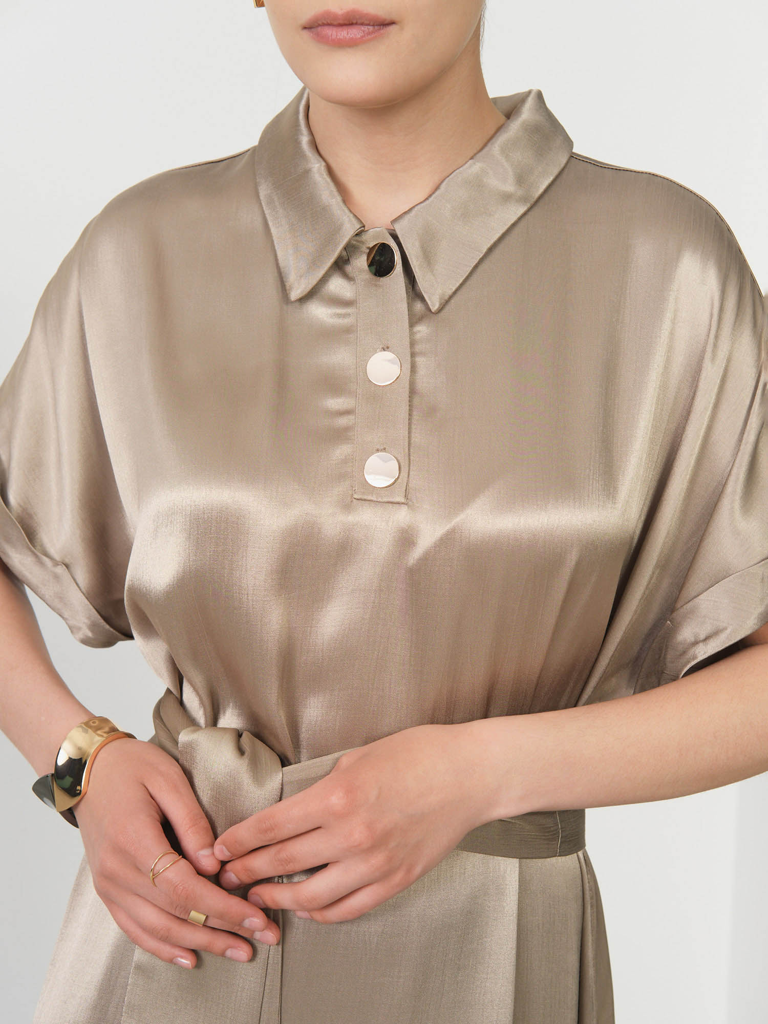 Элегантный воротник-стойка с декоративными пуговицами создает утонченный акцент, подчеркивая линию шеи и добавляя образу изысканности. Свободный крой обеспечивает комфорт и свободу движений, а пояс на талии формирует женственный силуэт и выгодно подчеркивает фигуру. Рукава с аккуратными манжетами завершают элегантный образ.
