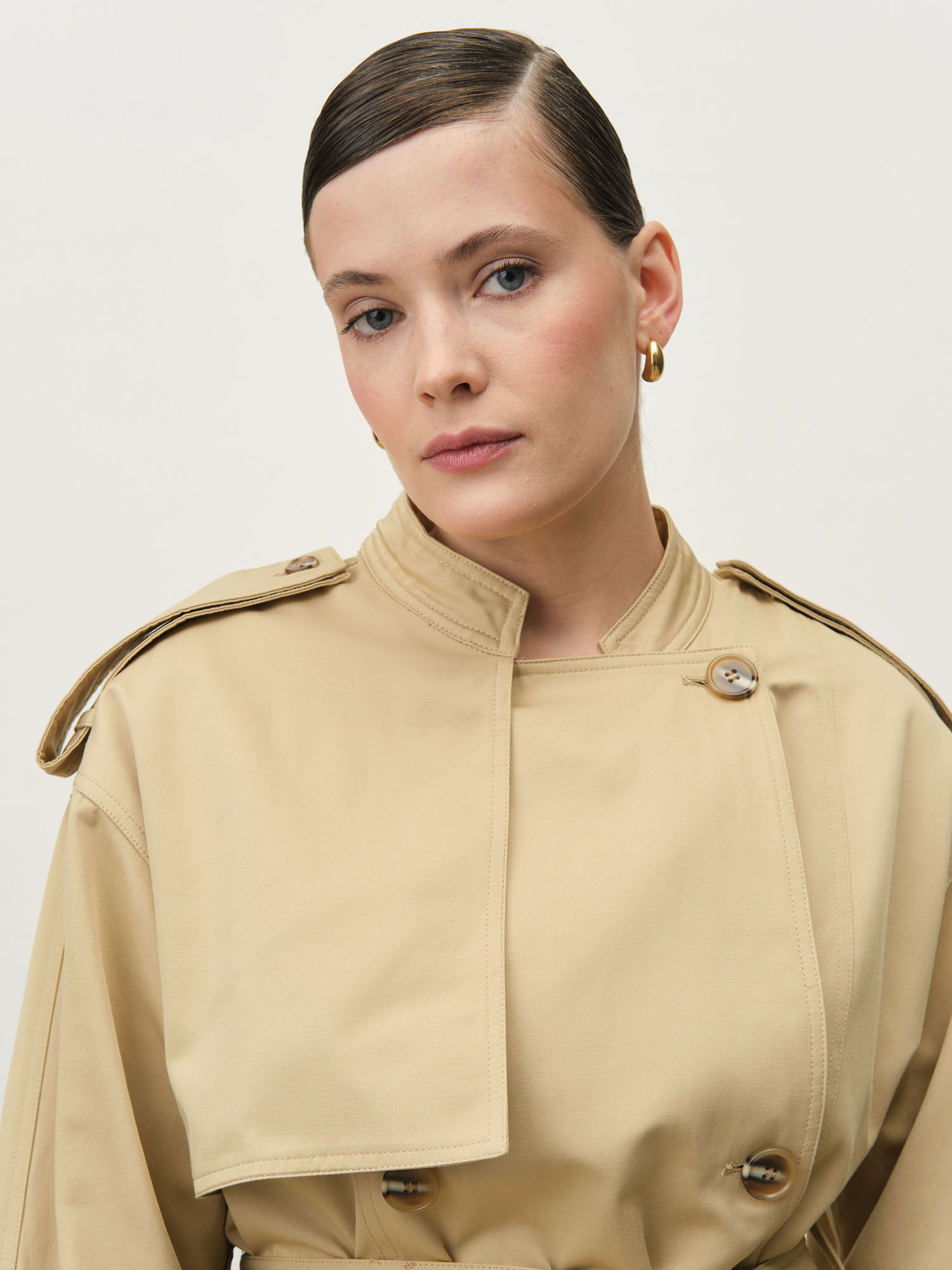 Приталенный силуэт с поясом, классический тренч-крой с акцентом на талии. Современная интерпретация базовой модели верхней одежды.