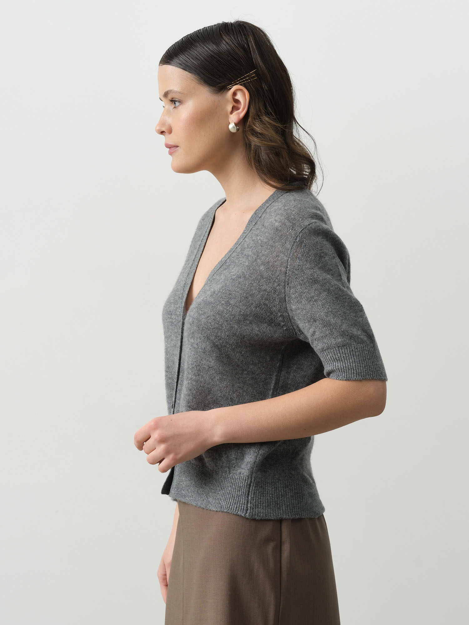 Лаконичный дизайн кардигана графитового цвета представляет собой безупречное сочетание классики и современности. Продуманный крой подчеркивает достоинства фигуры, создавая элегантный силуэт.